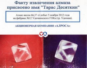 Драгоценный камень весом 66,37 карата, добытый в прошлом году в Якутии, получил минералогический паспорт. Алмазу официально присвоено имя Героя Социалистического Труда, выдающегося деятеля алмазной и золотодобывающей промышленности Тараса Десяткина.